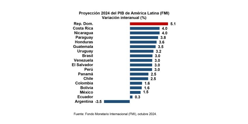 En el año 2024, el producto interno bruto (PIB) real de República Dominicana registró una expansión de 5.0 % respecto al 2023 que la colocó como líder en términos de crecimiento en América Latina en comparación con las 17 economías más grandes de la región y en consonancia con las estimaciones de los diferentes organismos internacionales, como el Fondo Monetario Internacional (FMI), el Banco Mundial (BM) y la Comisión Económica para América Latina y El Caribe (CEPAL).